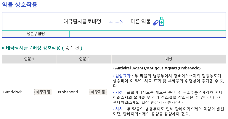 Famciclovir-Probenecid 약물 상호작용(출처:약학정보원)